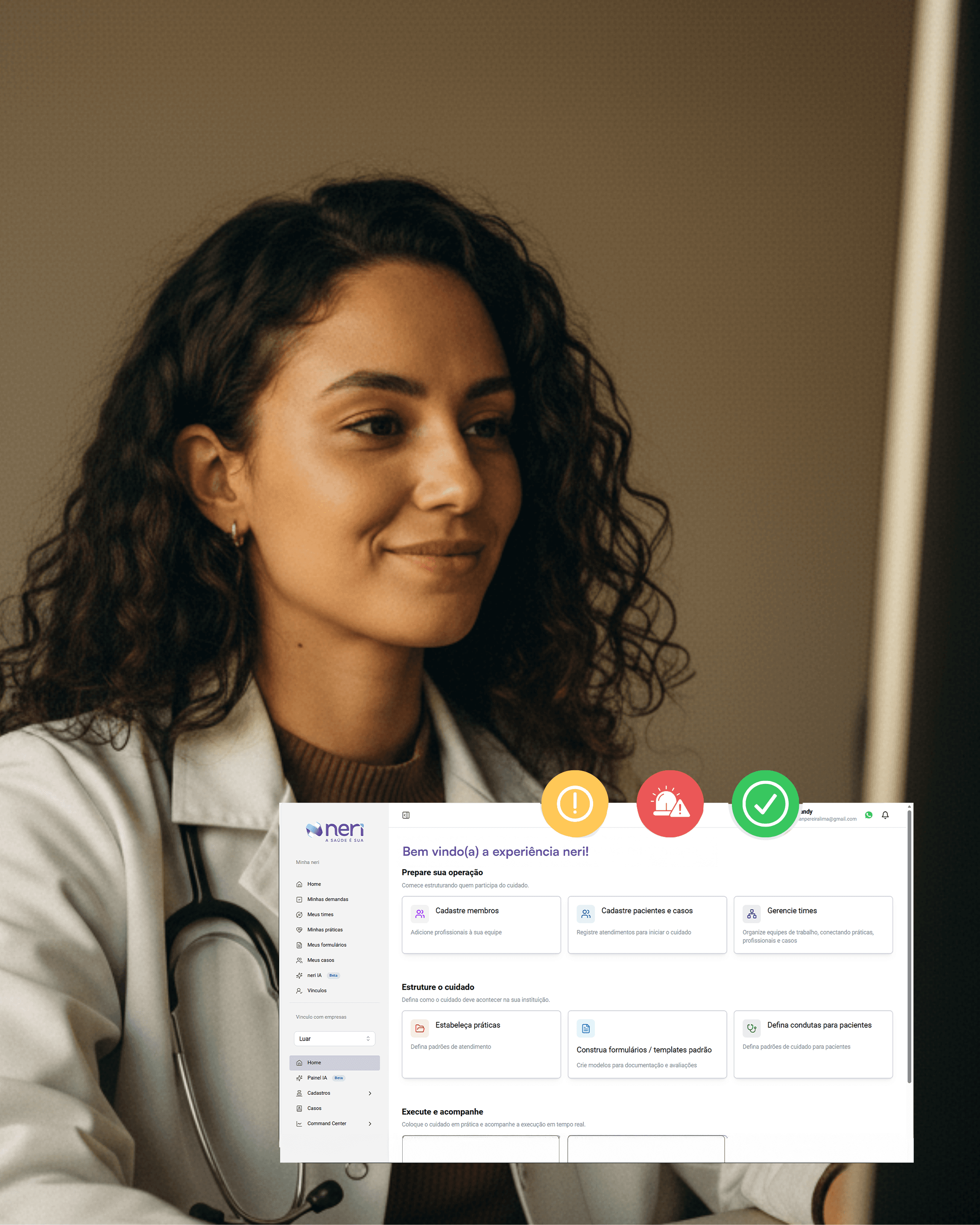 Transforma condutas clínicas em rotinas executáveis por cuidadores, familiares e pacientes, conectando todos em uma mesma rede de